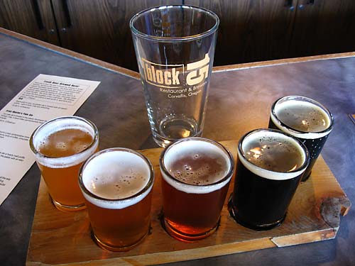 Update! November 30, 2011: During a recent stay in Corvallis, I re-visited the burgeoning Block 15 beer empire. In addition to their brewpub, they have now opened a European-style gastropub next door called Les Caves. It is European-style presumably because they serve a whole lot of bottled European beers (in addition to two Les Caves-only Block 15 beers) and the food’s much fancier than in the brewpub. Ended up tasting eleven more of their beers. Yikes! Good thing it was spread out over two days. The difference between the old and the new tasting notes are pretty noticeable…