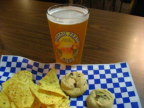 The Oregon Trail Brewery is in an odd location. It’s tucked into a corner of the Old World Deli, which has all sorts of old European facades inside to give you the feeling that you’ve stepped into a 19th century European village. Unfortunately, the cheap, cafeteria-style tables and chairs detract from the feeling. The little deli in the back has the Oregon Trail beer on tap, but they don’t have any formal taster trays. One of the women working there improvised with those little plastic salsa containers, though, and she gave me some complimentary chips to go along with the pint I eventually ordered. Did a brewery tour, which was fun. They’ve crammed a lot into their small but vertical footprint — the rooms aren’t particularly big, but they have three floors and have incorporated gravity into the beer-making process. Fun. Also got to try their Hopdoctor, a hopped-up version of the Beaver Tail, and it was really good.