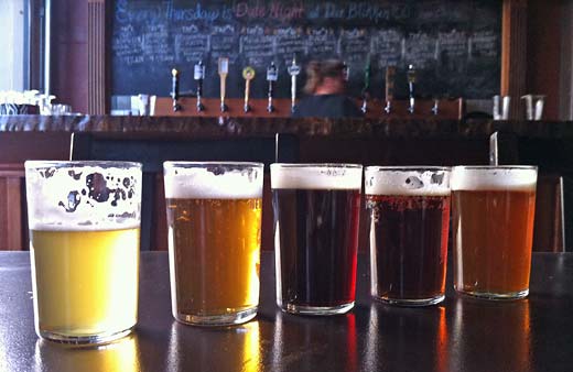 The original plan for Tour de Kitsap 2 was to visit the Silver City taproom in Bremerton after a brief stop at Slippery Pig, but the brief stop turned into a three hour tasting session — they had six beers on tap that I wanted to sample, and then a friend I hadn’t seen in a few years coincidentally showed up, and, well, the time just disappeared. Finally refocusing on the bike trip, I pedaled as quickly as I could from Poulsbo straight south to Silverdale, home of the Silver City Brewpub. For some reason I was dead set on visiting the fairly new taproom at their production brewery in Bremerton, and so I kept on pedaling, but by the time I got close it was 7:40 pm, and they closed at 8:00. And I was hungry. Finally resigned to changing my plan, I consulted Google Maps on my phone, and plowed my way through a less-than-bicycle-friendly route across northwest Bremerton until I found a reasonable, though hilly, east-west street, and reached Der Blokken (their facebook page is more up-to-date) at 8:40. Ferries back to Seattle that night left at 9:05 and 11:40. Harumph! I was too hungry to be tempted by the 9:05, and so I convinced myself that the 11:40 wouldn’t be so bad. I ordered a very tasty and astonishingly filling portobello sandwich and a taster set of Der Blokken beers. In addition to their own brews, they had a really good selection of other beers on tap.