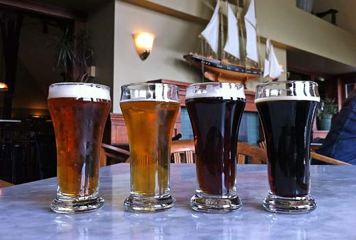 Sunday in Victoria turned out to be much more relaxed than I expected. Woke up somewhat early, so I ambled around downtown until I found a decent-looking cafe (with free wi-fi) for a caffeine pick-me-up. Back at the hostel, I leisurely packed my panniers before deciding it was finally time for the mellow bike ride to Spinnakers Brewpub. It’s a somewhat upscale place, which is why I scheduled it for a late brunch — dinner was a little too pricey for my not-quite-employed budget. They had eight brews on tap, and the first flight I selected (pictured below) was quite nice, so I doubled down and ordered a second to try them all.